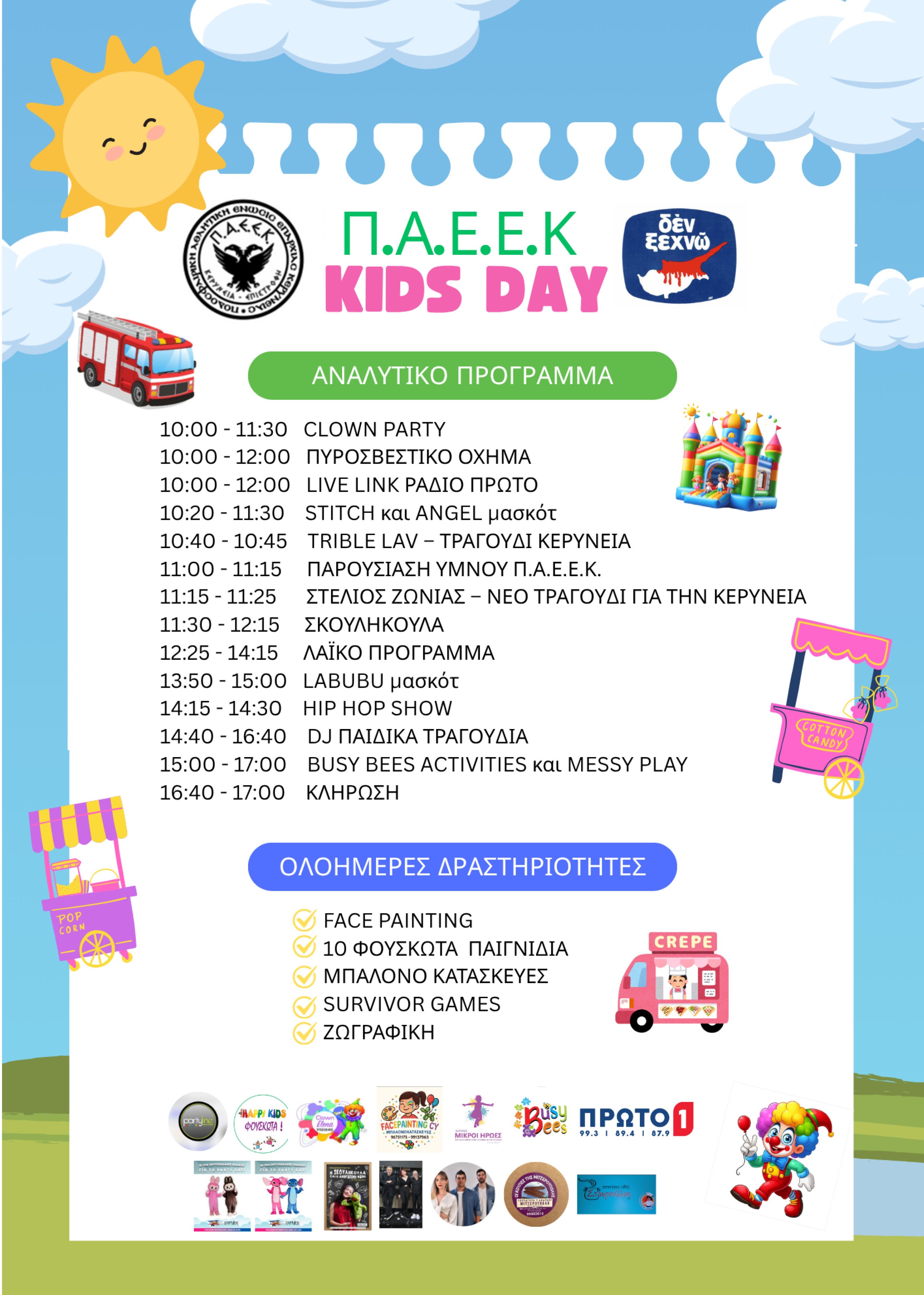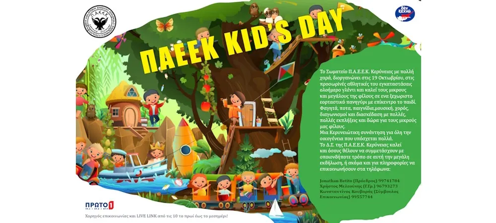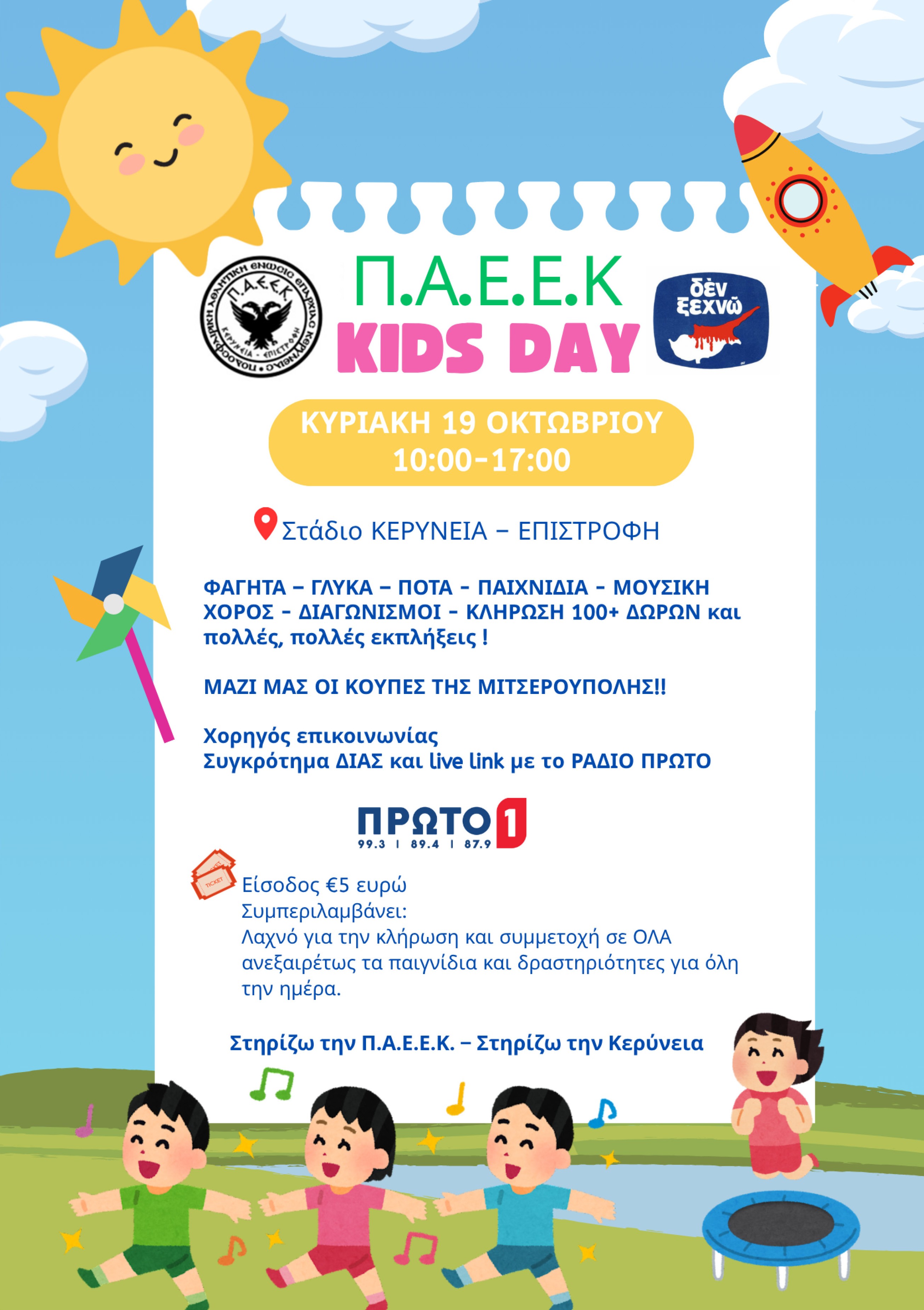 Το Σωματείο Π.Α.Ε.Ε.Κ. Κερύνειας και το Διοικητικό της Συμβούλιο με πολλή χαρά, διοργανώνει την Κυριακή, 19 Οκτωβρίου, στις προσωρινές αθλητικές του εγκαταστάσεις στο στάδιο «ΚΕΡΥΝΕΙΑ – ΕΠΙΣΤΡΟΦΗ» στον Στρόβολο, ολοήμερο παιδικό γλέντι από τις 10:00 – 17:00 και καλεί τους μικρούς και μεγάλους της φίλους σε μια ξεχωριστή εορταστική και παιγνιδιάρικη εκδήλωση με επίκεντρο το παιδί.