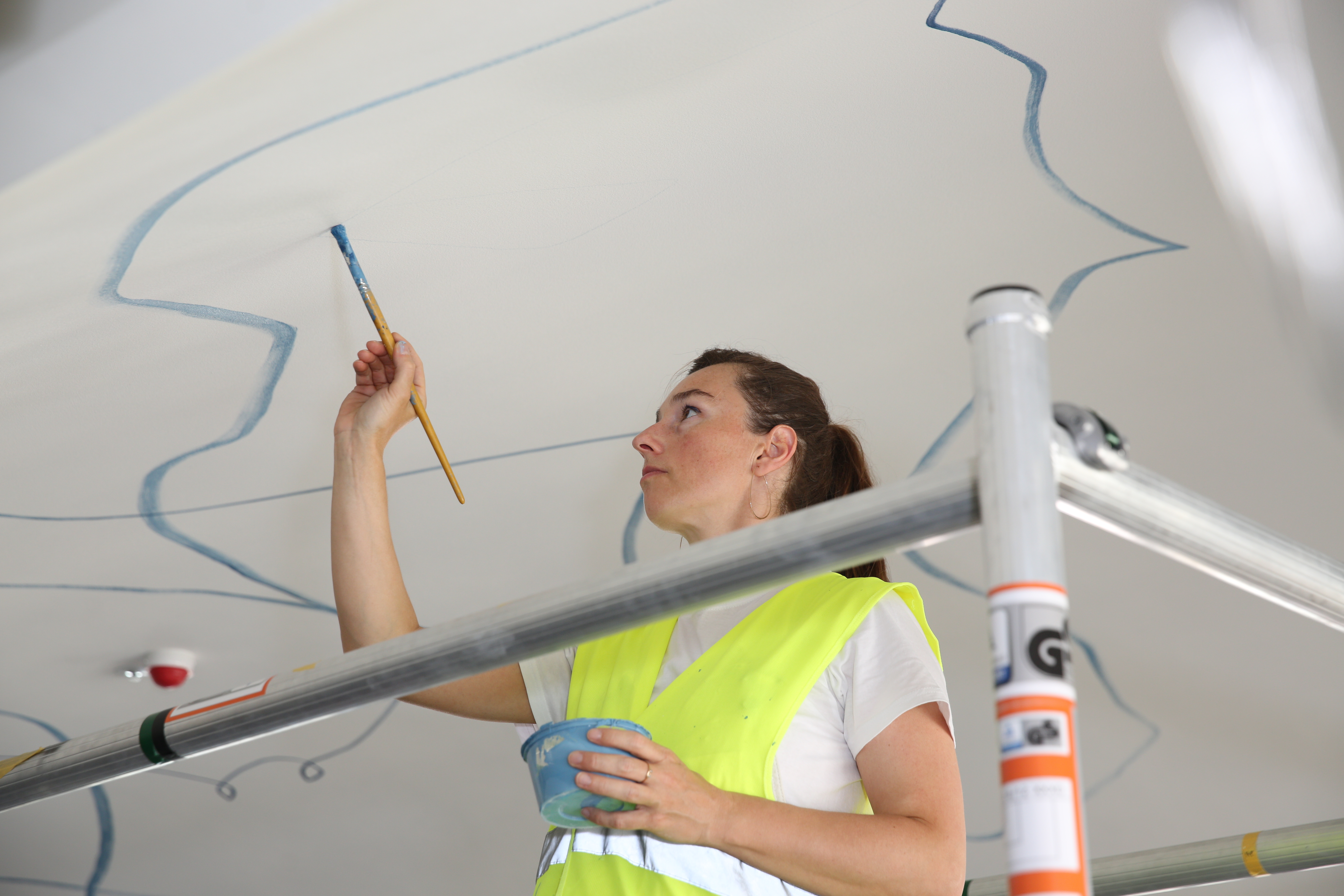 Το εντυπωσιακό αυτό έργο τέχνης καλύπτει ολόκληρη την οροφή με τα τέσσερα κοίλα μέρη της και εκτείνεται σε 206 τετραγωνικά μέτρα, ενώ είναι εμπνευσμένο από την κυπριακή κληρονομιά και αποτίνει φόρο τιμής στη μακρά και συναρπαστική ιστορία της πόλης. «Η εικαστική σύνθεση η οποία καλύπτει ολόκληρη την οροφή του Orangery αντικατοπτρίζει τη στενή σχέση της Λευκωσίας με το νερό, μία πολύτιμη πηγή ζωής. Με έμπνευση τις παραδοσιακές αυλές με τα πηγάδια και τα ρυάκια τους, όπου μέσα μεγάλωναν πορτοκαλιές, αυτό το έργο μεταμορφώνει αυτά τα στοιχεία που δίνουν ζωή σε γραμμές γεμάτες ροή. Αυτές οι φόρμες παραπέμπουν σε αρχαία κυπριακά μοτίβα, που κάποτε συναντούσαμε χαραγμένα σε κεραμικά σκευή και άλλα προϊόντα που οι κάτοικοι εξήγαγαν στην Μεσόγειο, ενώ ταυτόχρονα συμβολίζουν τις διαφορετικές ιστορίες και κουλτούρες που συναντώνται στη Λευκωσία, ένα «χωνευτήρι» πολιτισμών και ιστορίας. Το έργο προτρέπει τους επισκέπτες να αφήσουν τη φαντασία τους ελεύθερη, ενώ τιμά την έννοια της κοινότητας, της κληρονομιάς και του ποιητικού πνεύματος της κυπριακής φιλοξενίας», δηλώνει η καλλιτέχνιδα, η οποία ταξίδεψε μέχρι την Λευκωσία για πρώτη φορά στη ζωή της, προκειμένου να δημιουργήσει αυτό το μοναδικό έργο.