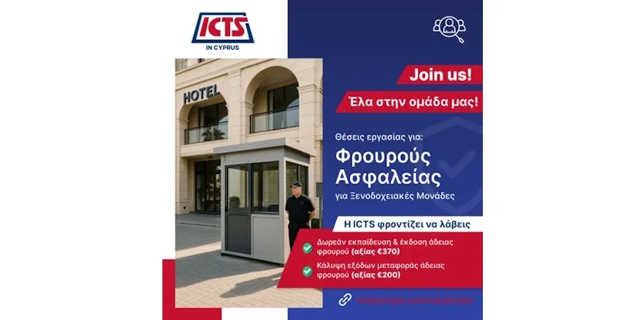 Η ICTS Κύπρου, μέλος του διεθνούς ομίλου ICTS Europe, ανακοινώνει ένα καινοτόμο πρόγραμμα επιδότησης εργασίας στον τομέα της ιδιωτικής ασφάλειας, προσφέροντας Bonus πρόσληψης ύψους 1.000€ καθαρά σε νέους Φύλακες Ασφαλείας που θα ενταχθούν στην εταιρεία έως και τις 31 Ιανουαρίου 2026. Παράλληλα, επιβραβεύει το σύνολο του προσωπικού της με Commitment Bonus μέχρι και 300€ για τον μήνα Οκτώβριο.