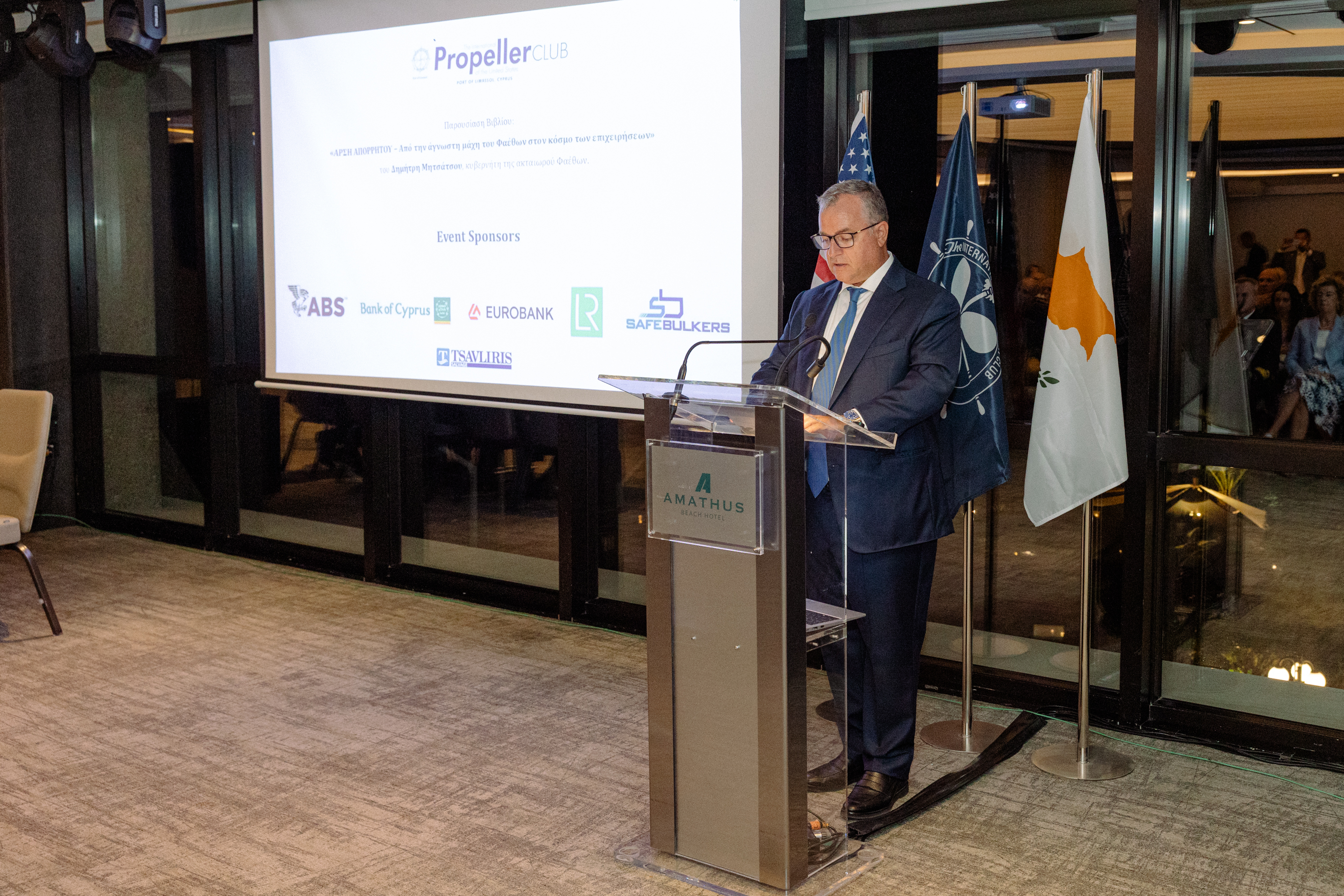 Ο κ. Φραγκούλης, στην ομιλία του, εξέφρασε τη συγκίνησή του για την πρώτη του επίσημη εκδήλωση στο εξωτερικό ως Πρόεδρος του Διεθνούς Propeller Club, αναδεικνύοντας τους βαθύτατους δεσμούς της Κύπρου με τον Ελληνισμό και την προσωπική του συμβολή στην επανίδρυση του Club της Λεμεσού. Εξήρε τον Κυβερνήτη Μητσάτσο ως αληθινό εθνικό ήρωα και επανέλαβε την αποστολή του Οργανισμού να προάγει τη ναυτιλιακή συνεργασία και να διαφυλάσσει την ιστορική μνήμη.