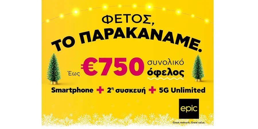 Αυτά τα Χριστούγεννα, το παρακάναμε. Ετοιμάσου για ανεπανάληπτες προσφορές που δεν θα πιστεύεις! Γιατί φέτος, η Epic σού δίνει την ευκαιρία να αποκτήσεις νέο smartphone και μαζί μία δεύτερη συσκευή και πλάνο 5G Unlimited, όλα με συνολικό όφελος έως €750.