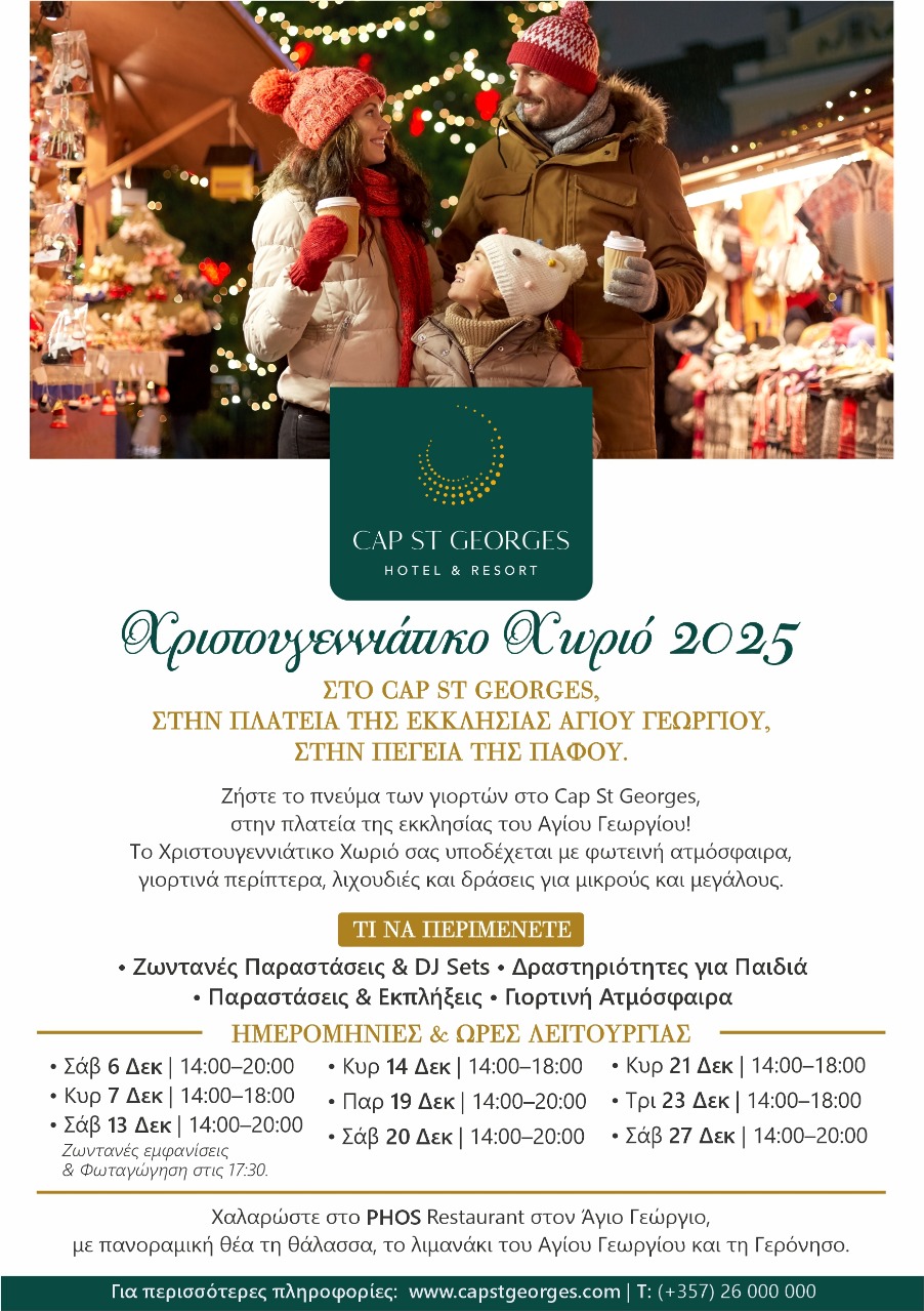 Αυτά τα Χριστούγεννα, η μαγεία ζωντανεύει σ’ ένα τόπο ξεχωριστό. Στο Cap St Georges, στην πλατεία της εκκλησίας Αγίου Γεωργίου, στην Πέγεια της Πάφου.