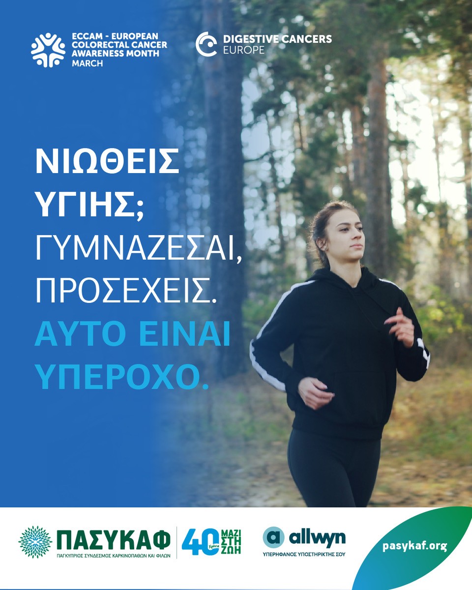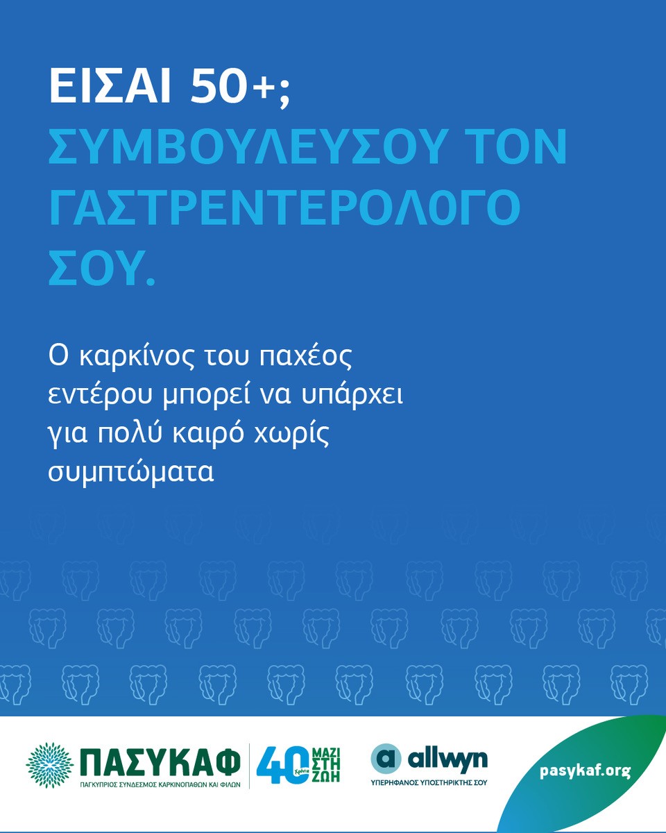 Ο ΠΑΣΥΚΑΦ, που φέτος ολοκληρώνει 40 χρόνια συνεχούς προσφοράς στην πρόληψη και στην αντιμετώπιση του καρκίνου, τιμά τον Παγκόσμιο Μήνα Καρκίνου του Παχέος Εντέρου πραγματοποιώντας παγκύπρια εκστρατεία ευαισθητοποίησης. Η εκστρατεία τελεί υπό την αιγίδα του Υπουργείου Υγείας και πραγματοποιείται σε συνεργασία με τη Γαστρεντερολογική Εταιρεία Κύπρου και την Ογκολογική Εταιρεία Κύπρου, ενώ υπερήφανος υποστηρικτής είναι η Allwyn. Ο ΠΑΣΥΚΑΦ είναι μέλος του DiCE – Digestive Cancers Europe, συμβάλλοντας ενεργά σε ευρωπαϊκές πρωτοβουλίες για την πρόληψη και αντιμετώπιση των καρκίνων του πεπτικού. Την εκστρατεία συνθέτει και υλοποιεί η Διεύθυνση Πρόληψης και Κοινωνικού Marketing του ΠΑΣΥΚΑΦ, ενώ η πρώτη παγκύπρια εκστρατεία για τον καρκίνο του παχέος εντέρου πραγματοποιήθηκε από τον ΠΑΣΥΚΑΦ το 2006 και συνεχίζεται έκτοτε κάθε χρόνο με συνέπεια.
