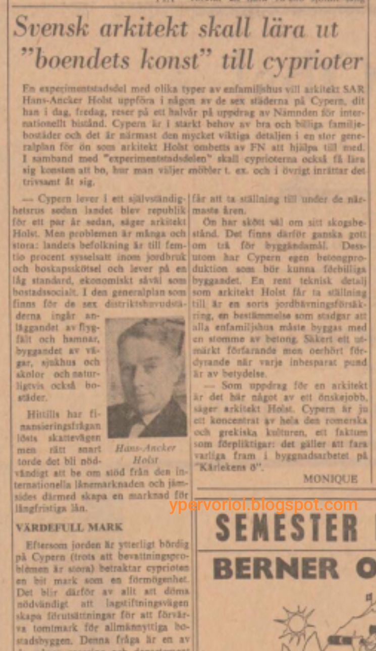 Το ιστολόγιο «Υπερβόρειοι» έφερε στο φως ένα ενδιαφέρον δημοσίευμα της εφημερίδας Svenska Dagbladet από τις 4 Μαΐου 1962, το οποίο αναφέρεται στην αποστολή του Σουηδού αρχιτέκτονα Hans-Ancker Holst στην Κύπρο. Ο Holst στάλθηκε στο νησί από τα Ηνωμένα Έθνη με σκοπό να συμβάλει στη δημιουργία σύγχρονων και οικονομικά προσιτών μονάδων στέγασης, σε μια περίοδο που η νεοσύστατη Κυπριακή Δημοκρατία αντιμετώπιζε οξυμένα στεγαστικά και πολεοδομικά προβλήματα.