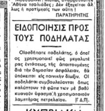 Εδώ η Πολιτεία προσπάθησε να βάλει τάξη. Προειδοποιούσε ότι όποιος χρησιμοποιεί «φως μεγάλης εντάσεως» κινδυνεύει με ποινική δίωξη, λες και ο ποδηλάτης της εποχής είχε κρυμμένους προβολείς LED στα συρτάρια του. Το πιο παράδοξο όμως είναι πως η ίδια η Πολιτεία συνέστηνε ως «ασφαλέστερη» λύση έναν… λαμπτήρα πετρελαίου. Ναι, έναν αναμμένο λαμπτήρα πετρελαίου στερεωμένο κάπως πάνω σε ποδήλατο που κινείται σε σκοτεινούς, ανώμαλους δρόμους του 1940.