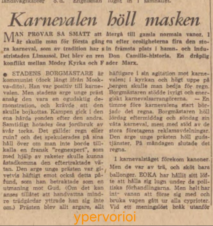 Στις 26 Μαΐου 1960, η σουηδική εφημερίδα Aftonbladet παρουσίαζε εκτενές αφιέρωμα στην Κύπρο, λίγους μήνες πριν από την ανακήρυξη της Κυπριακής Δημοκρατίας, μεταφέροντας την εικόνα μιας χώρας που επιχειρούσε να επιστρέψει στην κανονικότητα μετά από χρόνια έντασης. Με τίτλο «Το καρναβάλι κράτησε το προσωπείο του», ο ανταποκριτής περιέγραφε τη διστακτική επιστροφή στις παλιές συνήθειες. Όπως ανέφερε χαρακτηριστικά, «γίνονται δειλά βήματα για επιστροφή στις παλιές, κανονικές συνήθειες», ενώ για πρώτη φορά μετά τις ταραχές θα γιορταζόταν το μεγάλο καρναβάλι της Λεμεσού, της κατεξοχήν λιμενικής και βιομηχανικής πόλης. Όπως σημειώνεται η ΕΟΚΑ έχει τηρήσει την υπόσχεσή της να παραμείνει ήσυχη κατά τη διάρκεια των πολιτικών διαπραγματεύσεων.