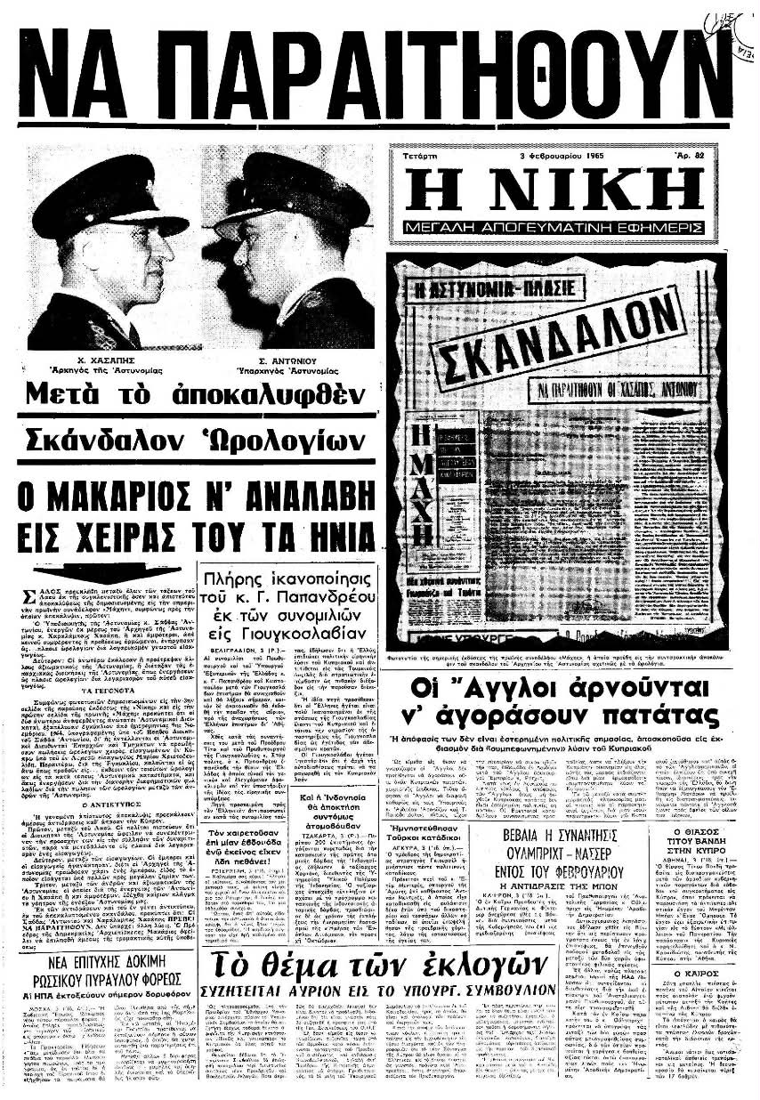 Φανταστείτε για μια στιγμή αστυνομικούς να μην κυνηγούν εγκληματίες αλλά να προωθούν… ρολόγια. Και όμως, στα μέσα της δεκαετίας του 1960 η κυπριακή κοινή γνώμη βρέθηκε αντιμέτωπη με μια υπόθεση που έμοιαζε σχεδόν απίστευτη. Έγγραφα που δημοσιοποιήθηκαν στον Τύπο αποκάλυπταν ότι μέσα στην ίδια την Αστυνομία είχε οργανωθεί μια διαδικασία προώθησης ρολογιών προς τα μέλη της δύναμης. Η αποκάλυψη προκάλεσε πολιτική θύελλα. Οι εφημερίδες μιλούσαν για «σκάνδαλο», ζητούσαν παραιτήσεις από την ηγεσία της Αστυνομίας και το θέμα έφτασε μέχρι τον ίδιο τον Πρόεδρο της Δημοκρατίας, τον Αρχιεπίσκοπο Μακάριο.
