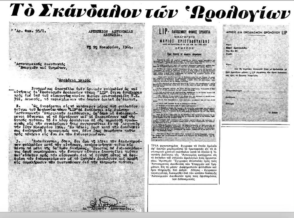 Η ιστορία περιστρεφόταν γύρω από τα ρολόγια της γαλλικής εταιρείας LIP, μιας μάρκας ιδιαίτερα γνωστής στην Ευρώπη εκείνη την εποχή. Στην Κύπρο, η διάθεσή τους φαίνεται ότι συνδέθηκε με μια διαδικασία προώθησης προς τους αστυνομικούς, με φυλλάδια που τους ενημέρωναν για τη δυνατότητα αγοράς των ρολογιών με ευνοϊκούς όρους πληρωμής. Από μόνη της μια τέτοια εμπορική προσφορά δεν θα προκαλούσε ιδιαίτερη αίσθηση. Όμως η υπόθεση πήρε διαφορετική τροπή όταν προέκυψαν έγγραφα που έδειχναν ότι η προώθηση των ρολογιών γινόταν μέσα από την ίδια την υπηρεσιακή δομή της Αστυνομίας.