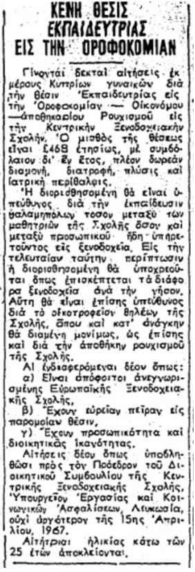Το μικρό αυτό απόκομμα του 1967 δεν είναι απλώς μια αγγελία για εργασία. Είναι ένα πυκνό κοινωνικό ντοκουμέντο. Ο τίτλος του, «Κενή θέσις εκπαιδεύτριας εις την οροφοκομίαν», ακούγεται σήμερα μακρινός, σχεδόν ξένος. Όμως ακριβώς αυτή η γλωσσική και θεσμική απόσταση είναι που το καθιστά πολύτιμο. Μέσα σε λίγες μόνο γραμμές, αποκαλύπτεται μια ολόκληρη εποχή: οι αντιλήψεις για τη γυναικεία εργασία, η οργάνωση της ξενοδοχειακής βιομηχανίας και η ανάγκη της τότε Κύπρου να εκσυγχρονιστεί μέσα από τον τουρισμό.