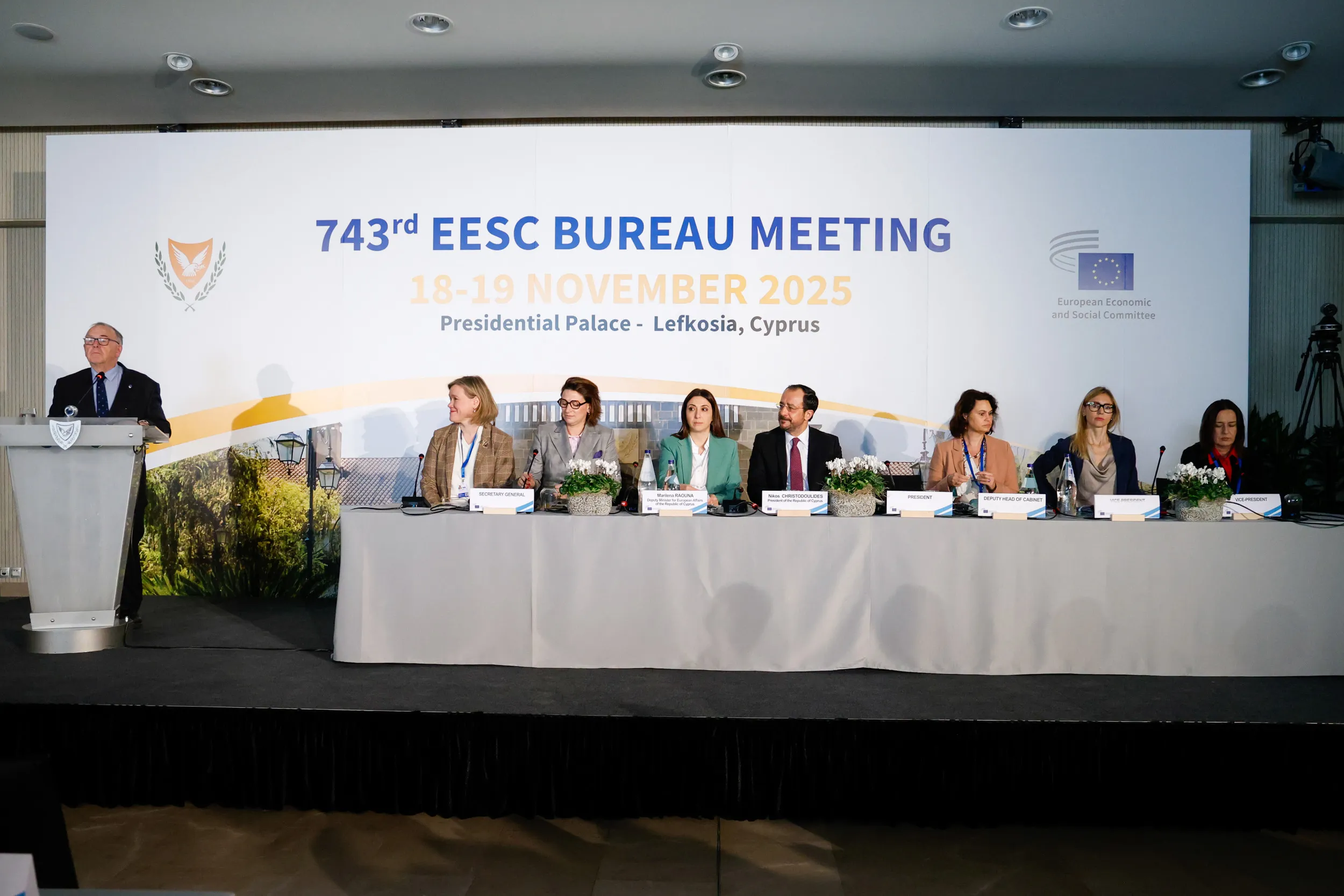 Ο Πρόεδρος της ΕΟΚΕ απηύθυνε ομιλία την Τετάρτη στο Προεδρικό Μέγαρο στη Λευκωσία, παρουσία του Προέδρου Χριστοδουλίδη και της Υφυπουργού Ευρωπαϊκών Υποθέσεων, Μαριλένας Ραούνα, καθώς το Προεδρείο της Επιτροπής συνεδριάζει στη Λευκωσία από χθες, ενόψει της Προεδρίας της ΕΕ.