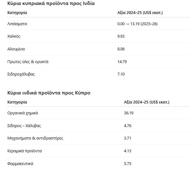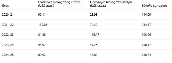 Τα δεδομένα δείχνουν ότι, παρά τις διακυμάνσεις, ο εμπορικός όγκος παραμένει σταθερός στο εύρος των 160–200 εκατ. δολαρίων. Οι εξαγωγές της Ινδίας κορυφώθηκαν το 2021–22, ενώ οι εισαγωγές της από την Κύπρο αυξήθηκαν σημαντικά το 2022–23.