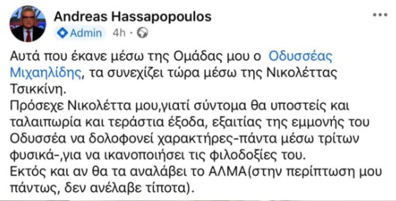 Σε μια παράλληλη εξέλιξη, ο Ανδρέας Χασαπόπουλος λέει πως αυτά που έκανε κ. Μιχαηλίδης μέσω της Ομάδας Καταπολέμισης της Διαφθοράς στο Facebook, τα συνεχιζει τώρα μέσω της κας. Τσικκίνης. Παράλληλα κατηγορεί τον κ. Μιχαηλίδη για εμμονή στην δολοφονία χαρακτήρων και προειδοποιεί την κα Τσικκίνη να προσέχε γιατί σύντομα θα υποστεί ταλαιπωρίες και έδοδα.