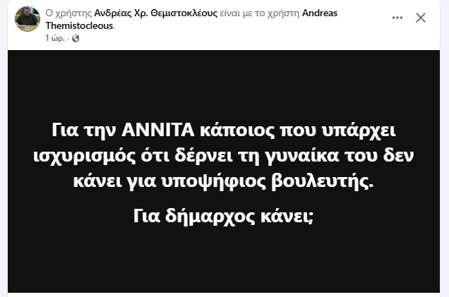 Στον απόηχο της υπόθεσης Σύκα αλλά των όσων διαρρέουν στα ΜΚΔ τις τελευταίες μέρες εναντίων του Δημάρχου Πάφου Φαίδωνα Φαιδωνος, ο κ. Θεμιστοκλέους έκανε την πιο κάτω ανάρτηση: «Για την Αννίτα κάποιος που υπάρχει ισχυρισμός ότι δέρνει τη γυναίκα του δεν κάνει για βουλευτής. Για Δήμαρχος κάνει;»