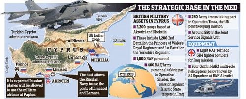 H Daily Mail, αναφέρει ότι θα έπρεπε να είχε ληφθεί υπόψη ότι η Κύπρος ήδη έχει δύο βρετανικές βάσεις με 3,200 στρατιώτες. Παρόλα αυτά, αναφέρει το δημοσίευμα, ο Νίκος Αναστασιάδης άφησε να εννοηθεί ότι τα ρωσικά πολεμικά αεροσκάφη, θα μπορούσαν να χρησιμοποιούν και την αεροπορική βάση στην Πάφο. Και όλα αυτά, αναφέρει το δημοσίευμα, την ίδια ώρα που γίνονται σκέψεις για επιβολή νέων κυρώσεων στη Ρωσία λόγω του ουκρανικού ζητήματος.