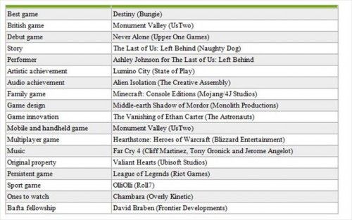 Αναλυτικότερα, η λίστα των παιχνιδιών που βραβεύτηκαν, είναι τα εξής: