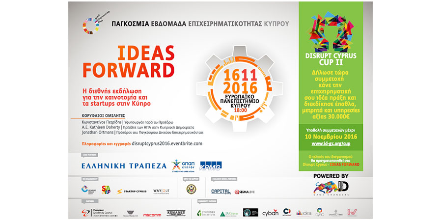 Με γιορτινή διάθεση, κορυφαίους διεθνείς ομιλητές, παρουσιάσεις, εκπλήξεις και τον τελικό του Disrupt Cyprus Cup για το οποίο διαγωνίζονται οι καλύτερες startups της Κύπρου, ανοίγει σήμερα, Τετάρτη 16 Νοεμβρίου 2016, η Παγκόσμια Εβδομάδα Επιχειρηματικότητας (ΠΕΕ) στην Κύπρο, παρουσία του Πρόεδρου της ΠΕΕ κ. Jonathan ORTMANS, στην εκδήλωση Disrupt Cyprus: Ideas Forward στο Ευρωπαϊκό Πανεπιστήμιο, στις 18:00.