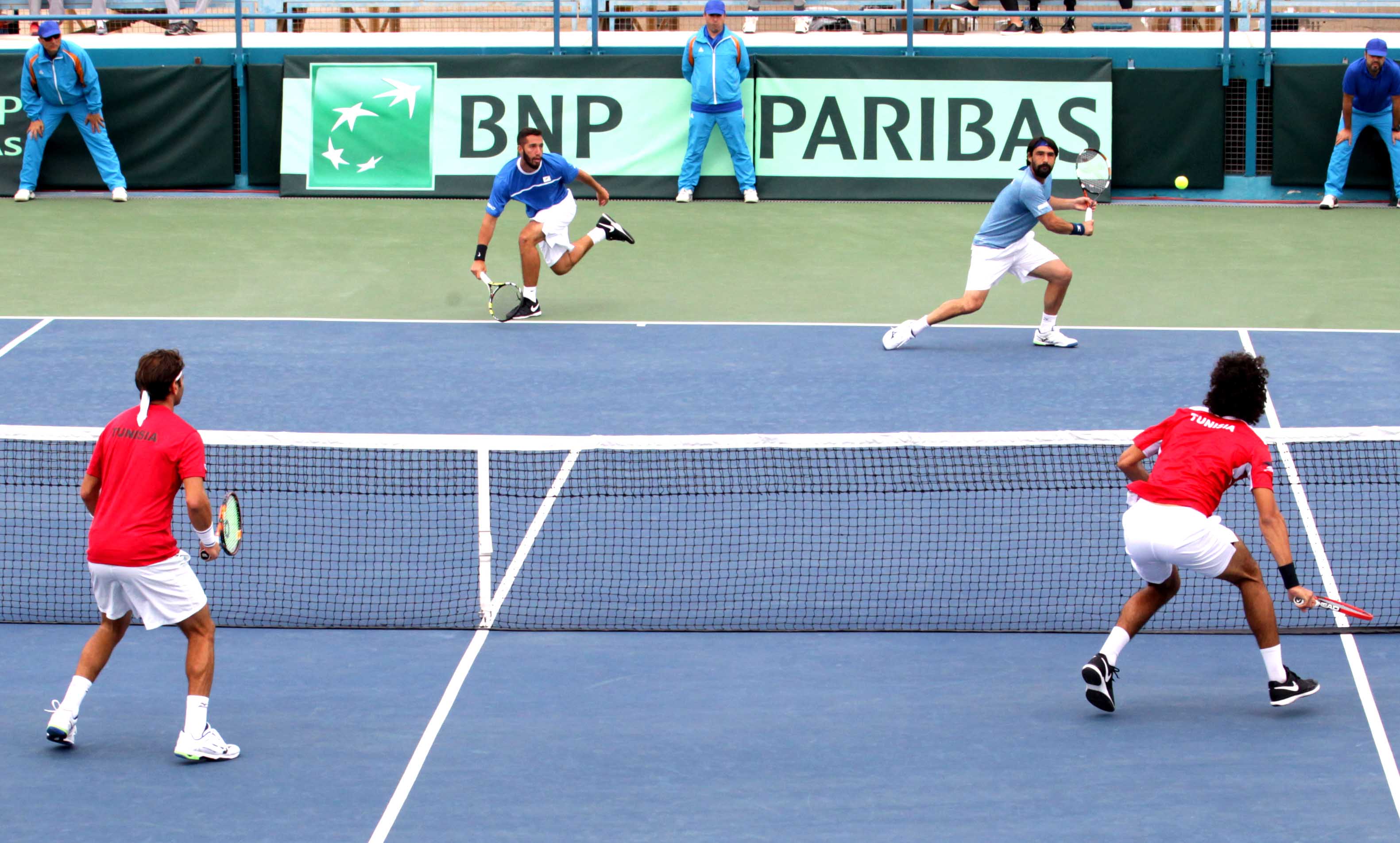 Ο αγώνας στο Διπλό ήταν συγκλονιστικός και άφησε ικανοποιημένους τους 1.000 περίπου φίλους του Τένις που βρέθηκαν στο Εθνικό Κέντρο Τένις για το θέαμα που παρακολούθησαν, όχι όμως και για το τελικό του αποτέλεσμα. Ύστερα από αγώνα τεσσάρων ωρών και δέκα λεπτών, οι Τυνήσιοι έφτασαν στη νίκη με 3-2, σε έναν αγώνα στον οποίο και οι δύο ομάδες βρέθηκαν σε κάποια σημεία του πολύ κοντά στη νίκη.