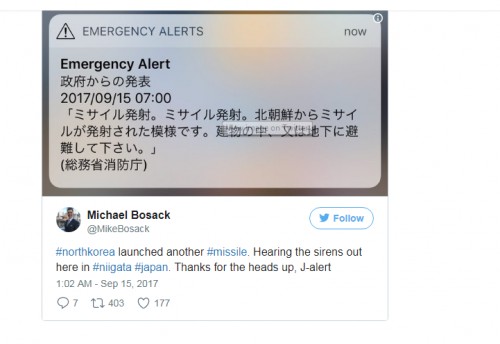Another missile launch from #NorthKorea. Japan's emergency alert system warning residents to take shelter right now. pic.twitter.com/sSq8t7MWm4