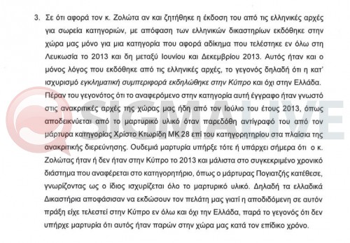 Αναφορικά με τον Μιχάλη Ζολώντα, η επιστολή αναφέρει ότι η απόφαση των ελληνικών αρχών για έκδοσή του στην Κύπρο στηρίχθηκε στο γεγονός ότι τα αδικήματα που του καταλογίζονταν έγιναν στην Κύπρο και όχι στην Ελλάδα. Δεν υπάρχει, όπως σημειώνεται, μαρτυρία ότι ο Ζολώτας ήταν ή δεν ήταν στην Κύπρο κατά τον επίδικο χρόνο, δηλαδή το 2013. Εσκεμμένα, ισχυρίζεται ο Ζολώτας δια των δικηγόρων του, αποστάλησαν αναληθή και λανθασμένα στοιχεία στις ελληνικές αρχές.
