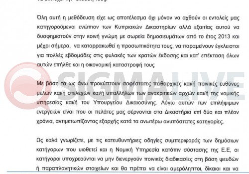 Στην επιστολή, μεταξύ άλλων, σημειώνεται ότι προκύπτουν με βάση τα στοιχεία που παρατίθενται ποινικές ή και πειθαρχικές ευθύνες μελών, στελεχών, ανακριτών ή και της Νομικής Υπηρεσίας και του Υπουργείου Δικαιοσύνης.