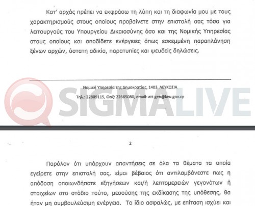 Ο Γενικός Εισαγγελέας, σε επιστολή που επίσης έχει στην κατοχή του το SigmaLive, εκφράζει λύπη και διαφωνία με τους ισχυρισμούς με τους οποίους «αποδίδονται ενέργειες όπως εσκεμμένη παραπλάνηση ξένων αρχών, ύστατη αδικία, παρατυπίες και ψευδείς δηλώσεις».