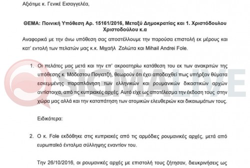 Στην εν λόγω επιστολή απαντά ο Γενικός Εισαγγελέας, ο οποίος μεταξύ άλλων εκφράζει την λύπη του για τα όσα καταλογίζονται από τους δυο. Σε ό,τι αφορά τον Fole, αναφέρεται ότι κατά την έκδοσή του στην Κύπρο από τις ρουμανικές αρχές, ζητήθηκε από τους τελευταίους διευκρίνιση αναφορικά με τον ακριβή τόπο και χρόνο διάπραξης των αδικημάτων. Αρμοδίως, όπως αναφέρεται, το Υπουργείο Δικαιοσύνης απάντησε ότι τα αδικήματα που αφορούσαν τον Φόλε έλαβαν χώρα μεταξύ Ιουλίου 2007 και Σεπτεμβρίου 2009 σε Λευκωσία και Αθήνα. Με τα δεδομένα που δόθηκαν, το ρουμανικό Δικαστήριο εξέδωσε τον Φόλε στις κυπριακές αρχές αφού κρίθηκε ότι δεν ετίθετο ζήτημα παραγραφής αδικημάτων.