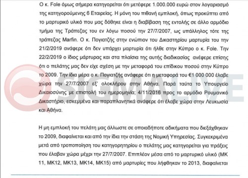 Ο Φόλε κατηγορείται ότι μετέφερε 1 εκατομμύριο ευρώ στην εταιρεία Focus. Στις επιστολές γίνεται αναφορά και στο μαρτυρικό υλικό της υπόθεσης αλλά και στις μαρτυρίες που ακούστηκαν ενώπιον Δικαστηρίου. Από τις μαρτυρίες προκύπτει, σύμφωνα με την επιστολή, ότι ο Φόλε δεν ήρθε στην Κύπρο και ότι ο Φόλε δεν ενεπλάκη στην μεταφορά του 1 εκατομμυρίου. Σύμφωνα με την επιστολή, εδώ εγείρεται ζήτημα παραπλάνησης των ρουμανικών αρχών από τις κυπριακές, οι οποίες ενημέρωναν ότι τα αδικήματα για τα οποία είναι ύποπτος έγιναν σε Κύπρο και Ελλάδα. Έτσι, όπως σημειώνεται, παραβιάζεται και το δικαίωμα στην δίκαιη δίκη.