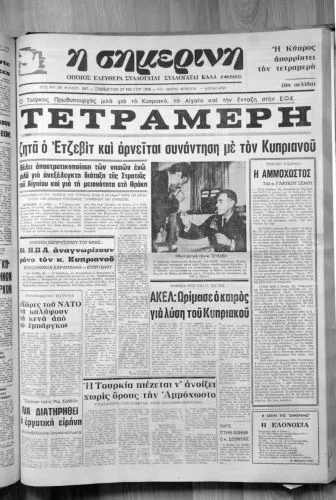 «Τετραμερή ζητά ο Ετζεβίτ και αρνείται συνάντηση με τον Κυπριανού - Θέλει αποστρατικοποίηση των νησιών, ενώ μιλά για ανεξέλεγκτη διάταξη της Στρατιάς του Αιγαίου και για τη μειονότητα στη Θράκη - Επαναλαμβάνει ότι "εχθρός της Τουρκίας είναι η Ελλάδα", χωρίς να δικαιολογεί την άρνηση υπογραφής συμφώνου μη επιθέσεως», είναι ο τίτλος του κυρίου θέματος της «Σημερινής», ημερομηνίας 27 Μαΐου 1978, κάτω από τον οποίο γράφει: