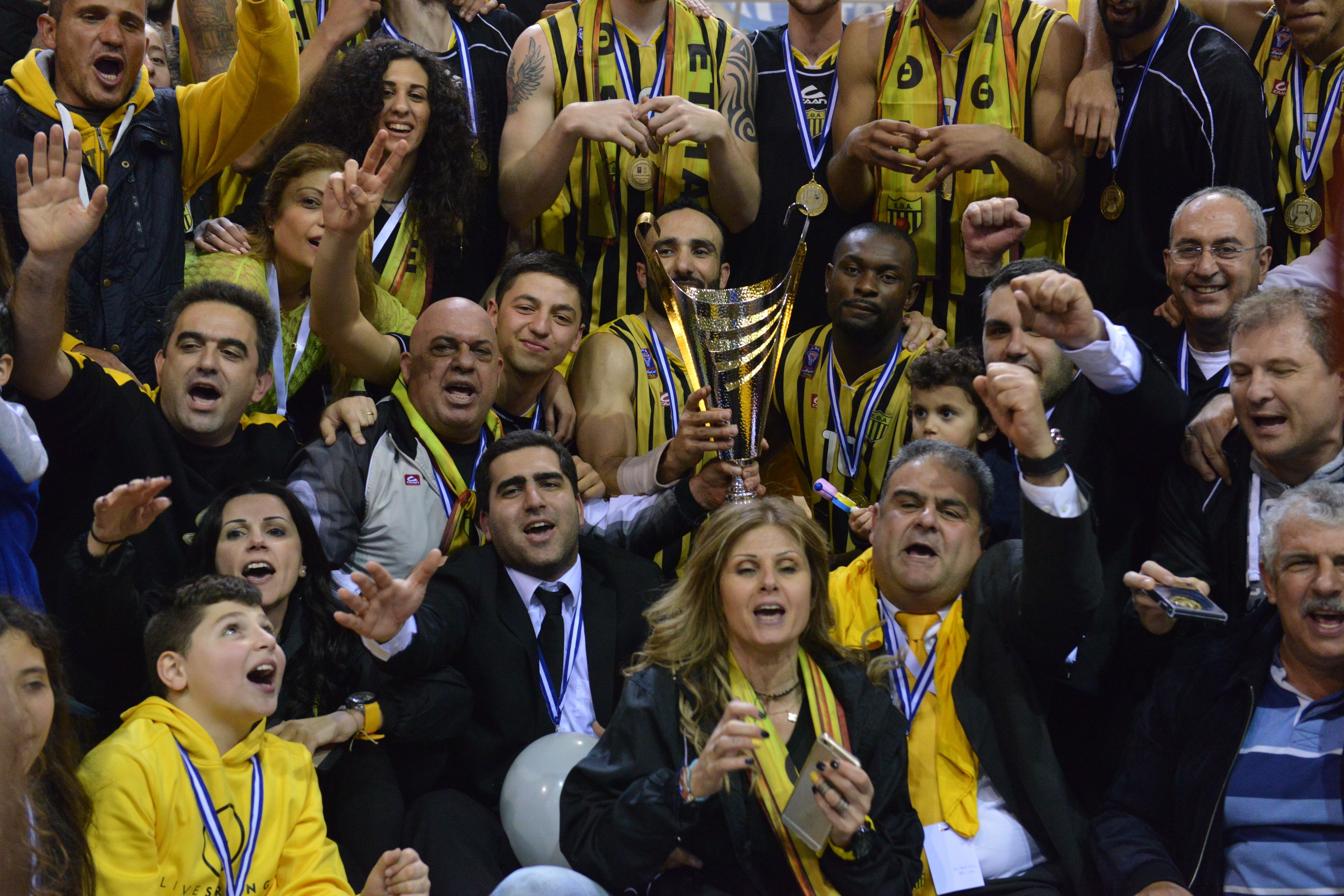 Η κατάκτηση του 3ου τροπαίου κυπέλλου στην ιστορία της δεν έφερε απογείωση... ενθουσιασμού στις τάξεις των ηγετών, προπονητών και καλαθοσφαιριστών της ΕΘΑ. Η χαρά, βέβαια, ήταν διάχυτη στις εκδηλώσεις τους με το πέρας του τελικού και της νίκης τους με 58-52 επί του ΑΠΟΕΛ το βράδυ της Παρασκευής (27 Φεβρουαρίου) στο «Κίτιον». Χαρά και πανηγύρια που κράτησαν αρκετά λεπτά μετά μέσα στον αγωνιστικό χώρο, όπου ατυχώς παρέμειναν κουρασμένοι μέχρι τις 23:00 περίπου το βράδυ, αφού όλη η αποστολή περίμενε τον Ματ Ρος να εκπληρώσει την υποχρέωσή του στην Εθνική Επιτροπή Αντιντόπινγκ. Η πολύωρη παρουσία των «κιτρινόμαυρων» στο γήπεδο μάς έδωσε την ευκαιρία να κουβεντιάσουμε με τους πρωταγωνιστές, αφού η αδρεναλίνη πλέον είχε καταλαγιάσει και τα λόγια έβγαιναν με περισσότερη λογική παρά ενθουσιασμό.