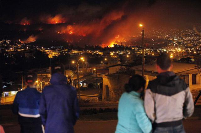 Την πόλη Βαλπαραΐσο της Χιλής απειλεί η τεράστια πυρκαγιά που μαίνεται εκτός ελέγχου σε δασική περιοχή στα κεντρικά της χώρας. Σύμφωνα με ανακοίνωση που εξέδωσε η υπηρεσία εκτάκτων αναγκών (ONEMI), τουλάχιστον 4.500 κάτοικοι εκκένωσαν τις κατοικίες τους, προληπτικά, στη Βαλπαραΐσο και τη γειτονική πόλη Βίνα ντελ Μαρ, ενώ και οι δύο περιοχές έχουν κηρυχθεί σε κατάσταση έκτακτης ανάγκης. Η τεράστια πυρκαγιά εξαπλώνεται με ταχείς ρυθμούς, ενώ στους 15.000 ενδέχεται να αυξηθεί ο αριθμός των κατοίκων που θα αναγκαστούν να εγκαταλείψουν τα σπίτια τους.