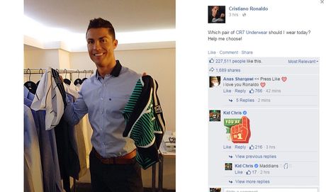 Ο Κριστιάνο Ρονάλντο προσπαθεί να... συνέλθει από την απώλεια τόσο του πρωταθλήματος όσο και του Champions League και για αυτό ζήτησε την βοήθεια από τους φίλους του στο facebook για να... διαλέξει εσώρουχο.