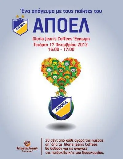 Για ακόμη μία φορά ο ΑΠΟΕΛ δείχνει το κοινωνικό του πρόσωπο. Οι ποδοσφαιριστές των «γαλαζοκιτρίνων» θα μαζευτούν το απόγευμα από τις 4-5 το απόγευμα στο Gloria Jean’s Coffee της Έγκωμης για να βοηθήσουν με τη σειρά τους για τις ανάγκες της παιδοκλινικής του Νοσοκομείου. 20 σεντ από την κάθε αγορά καφέ θα διατεθούν από την γνωστή αλυσίδα καφέ στο τμήμα της παιδοκλινικής, ενώ ο κόσμος ο οποίος θα παρευρεθεί θα έχει την ευκαιρία να φωτογραφηθεί με τους «γαλαζοκίτρινους».